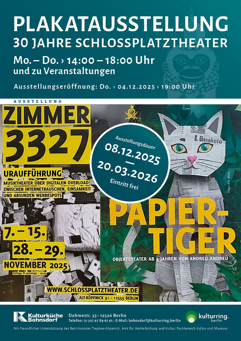 2025 beging das Schlossplatztheater in Köpenick sein 30jähriges Bestehen. Mit der Präsentation von Aufführungsplakaten, die als Retrospektive den Qualitätsanspruch, die Experimentierfreude und das aktuelle Engagement belegen, gratuliert die Kulturküche Bohnsdorf zum Jubiläum und möchte gleichzeitig auf den hohen Wert des in drei Jahrzehnten gewachsenen Schlossplatztheaters aufmerksam machen.
